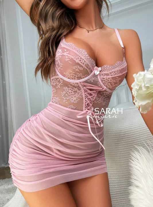Lace Up Front Contrast Mesh Lace Garter Corset Lingerie Set طقم شبك مع شراب
