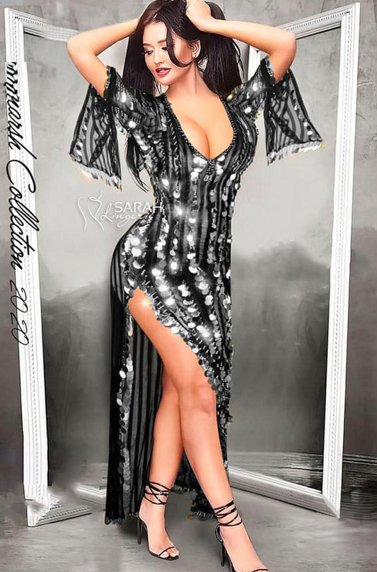 طقم 3 قطع مع سلسله حزام-Piece3 Set Drawstring Waist Slimming Long Dress+Thong+Chain Decor Belt