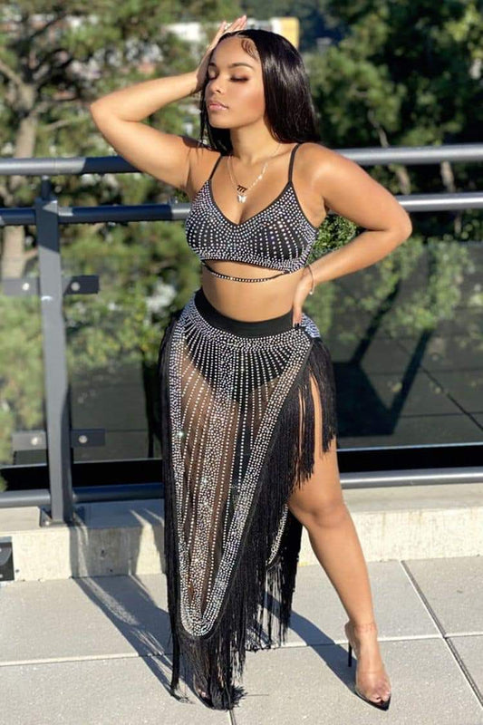 Rhinestone Nylon Crystal Top Crotchless Pantyhose 2 Piece Suit شبك قطعتين مطرز