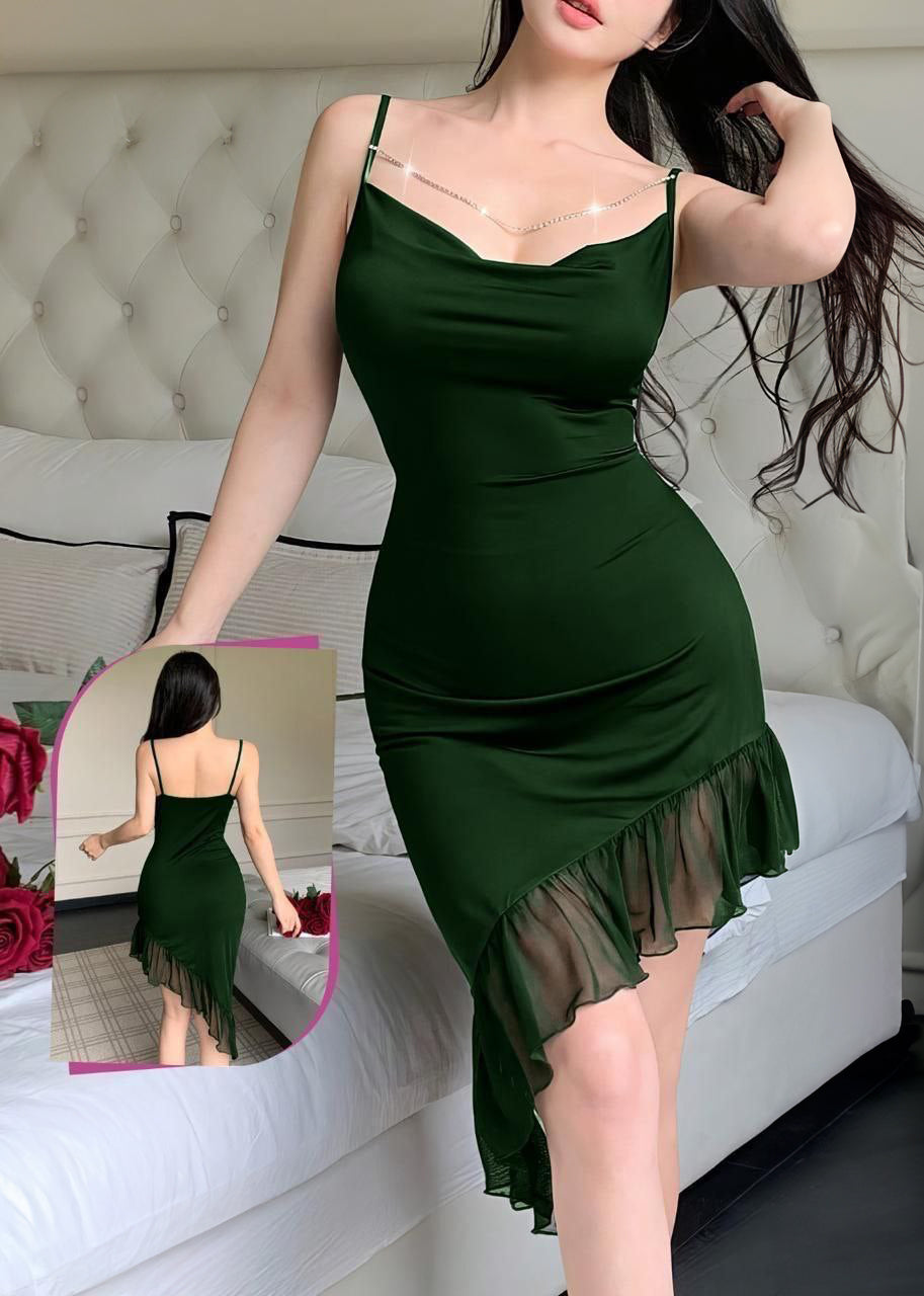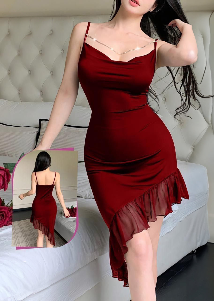 طقم 3 قطع مع سلسله حزام-Piece3 Set Drawstring Waist Slimming Long Dress+Thong+Chain Decor Belt
