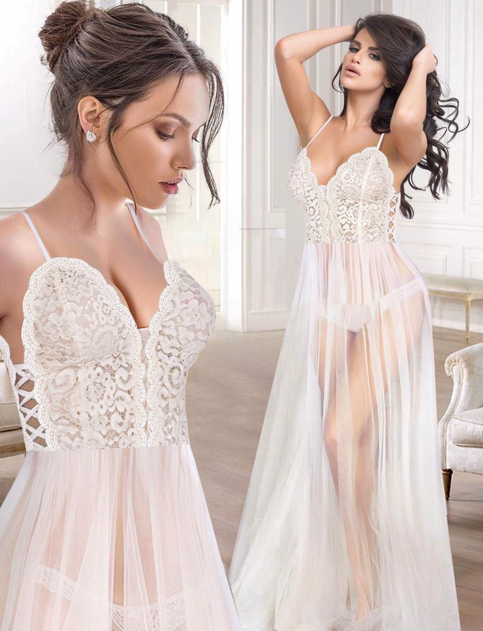 طقم 3 قطع مع سلسله حزام-Piece3 Set Drawstring Waist Slimming Long Dress+Thong+Chain Decor Belt