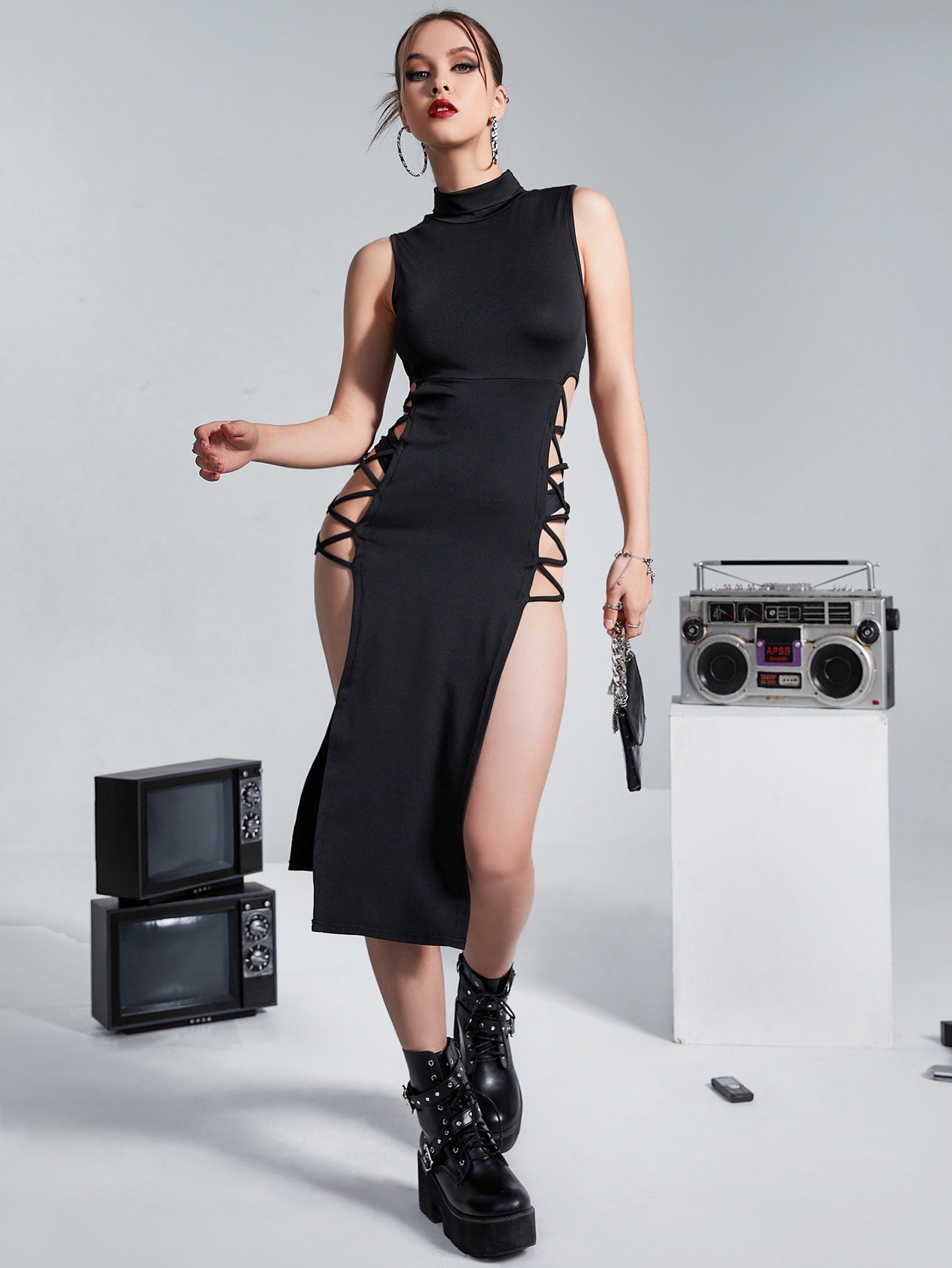 ock Neck Lace Up Side Split Thigh Dressو