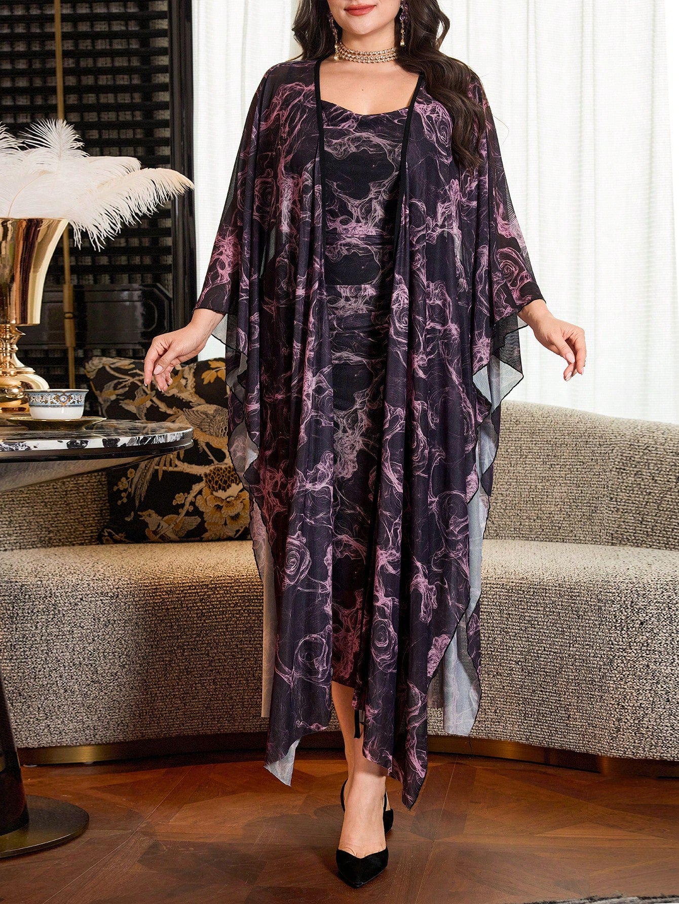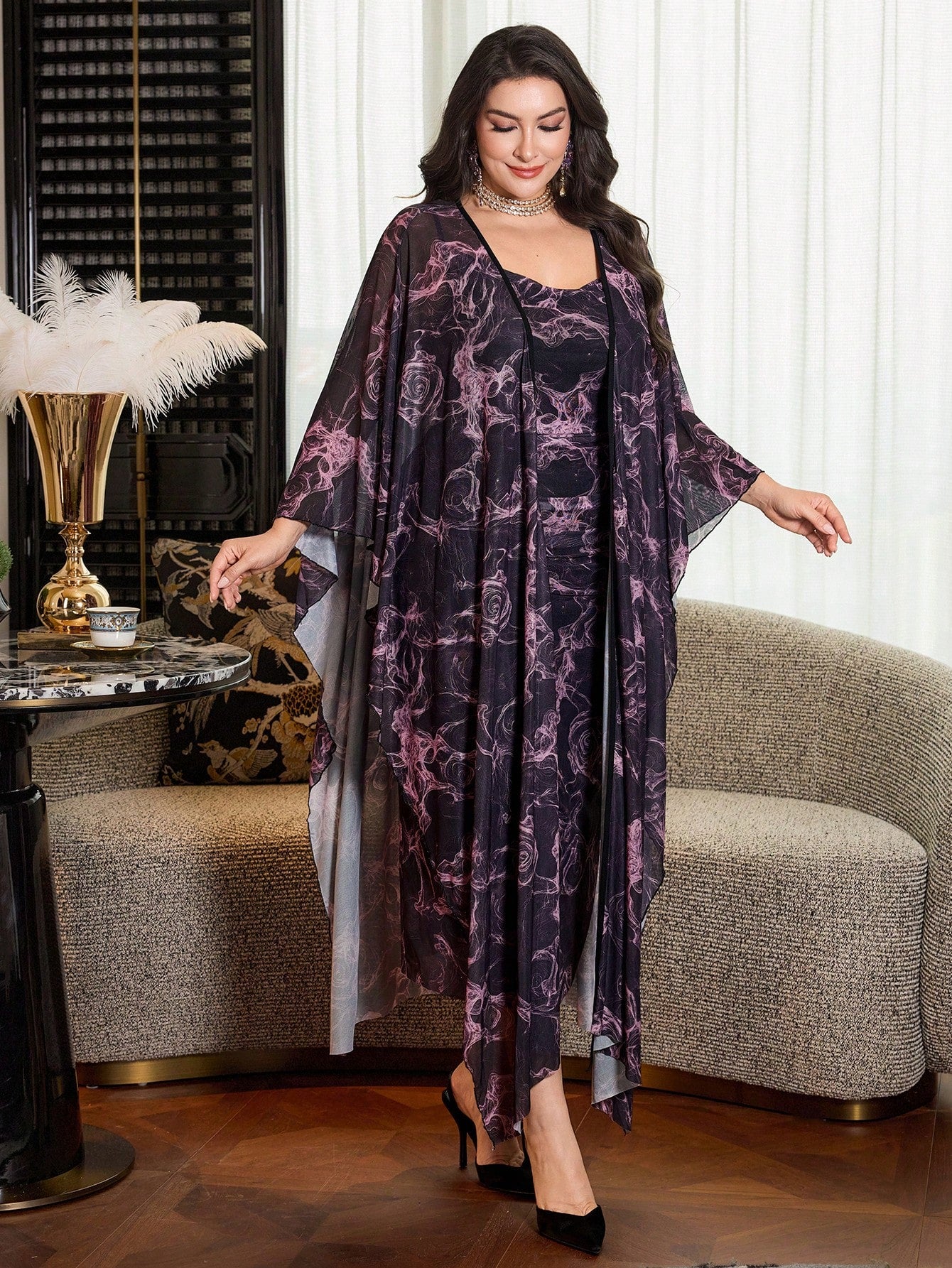 Modelyn Leopard Floral Print Loose Lantern Sleeve Chiffon Dress, Luxurious 2 Pieces Set For Women SKU: sz2412169867204262